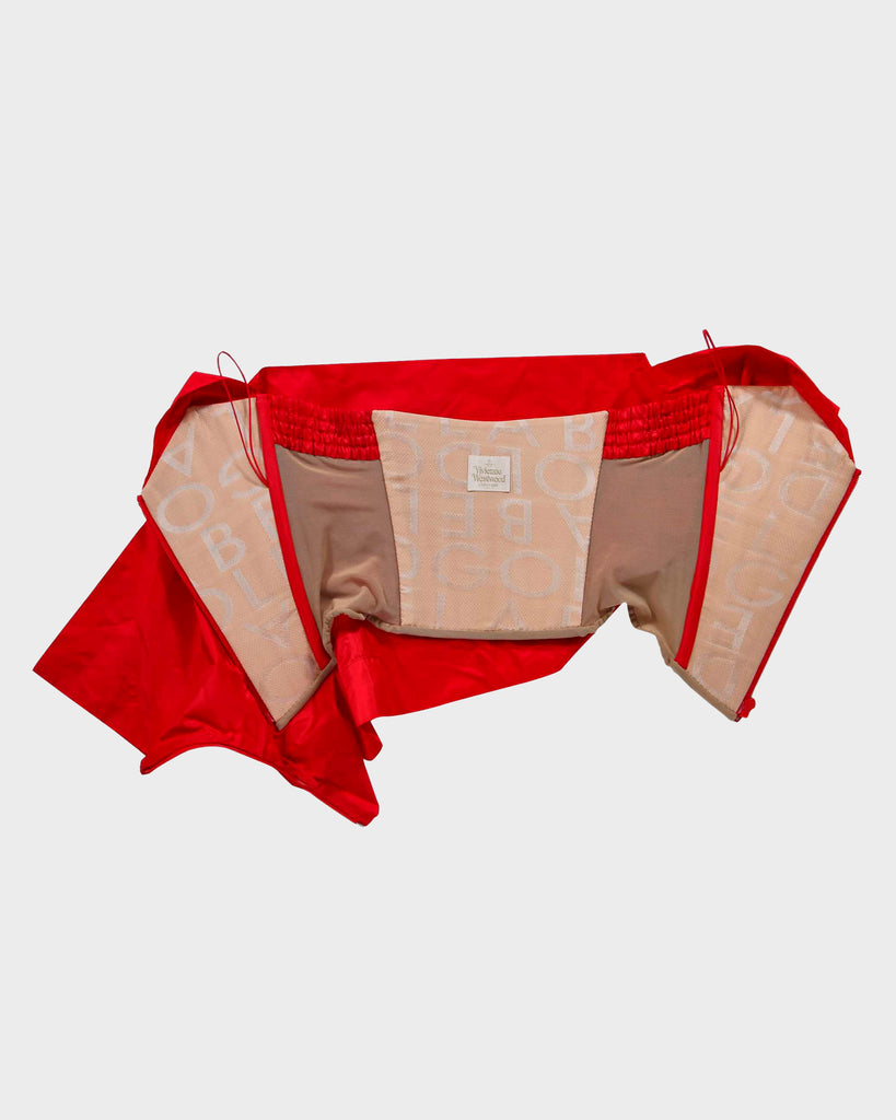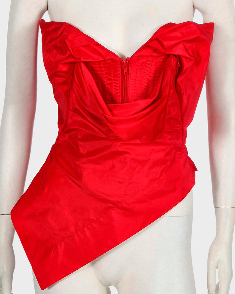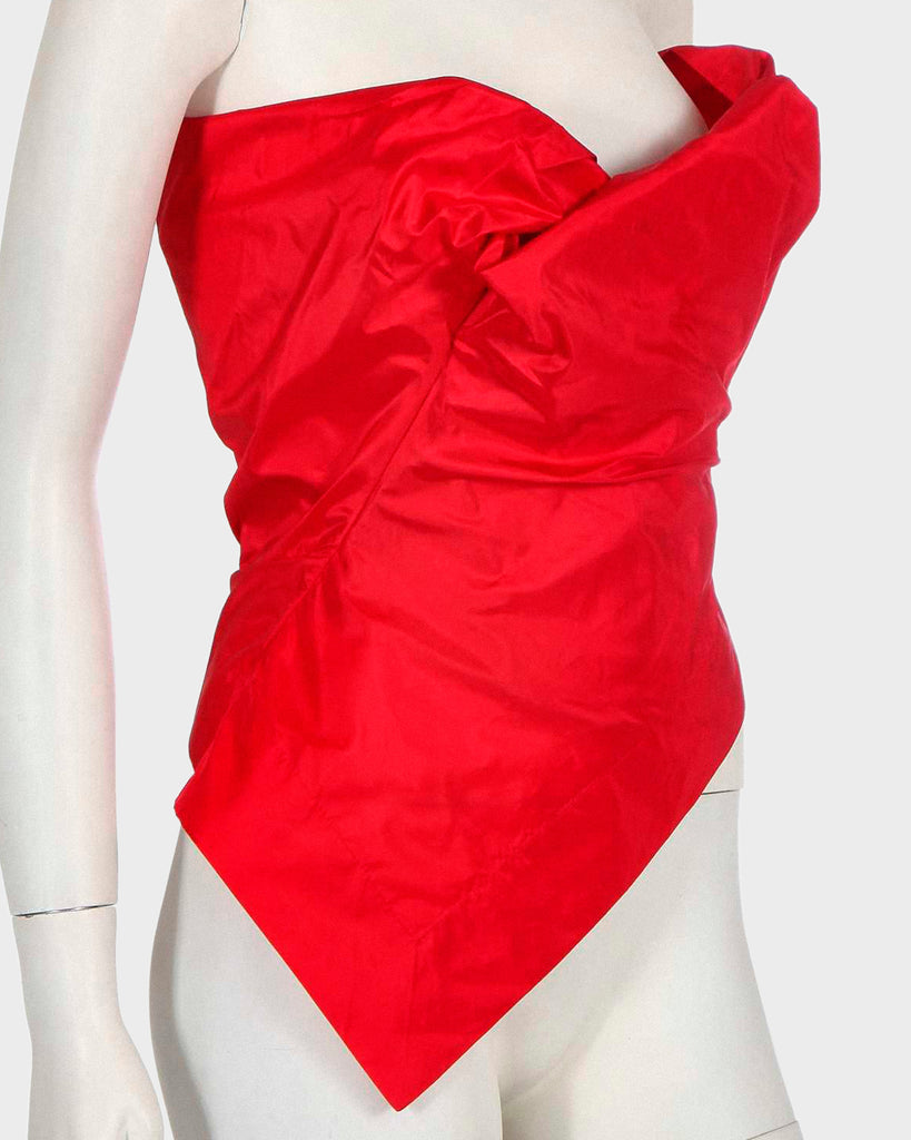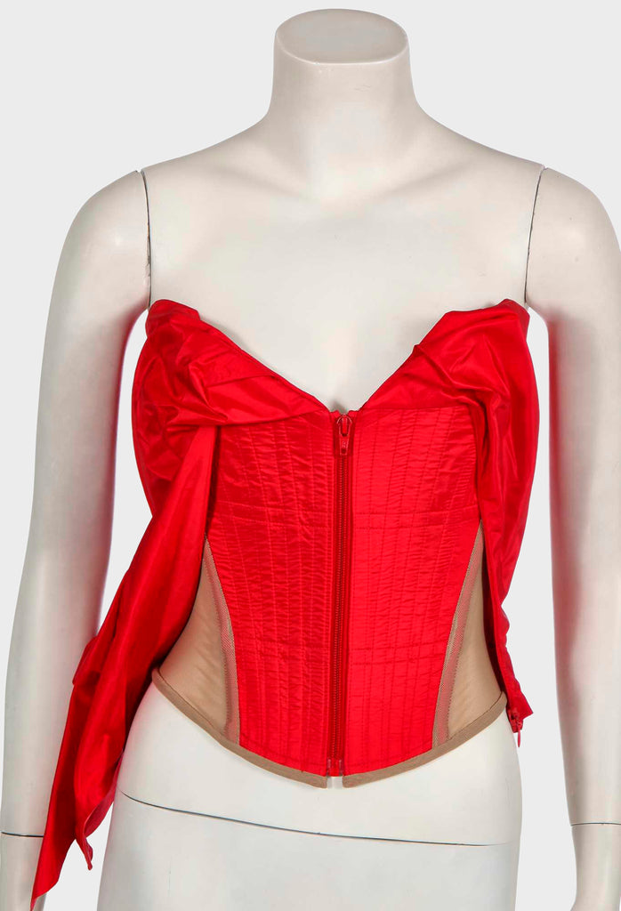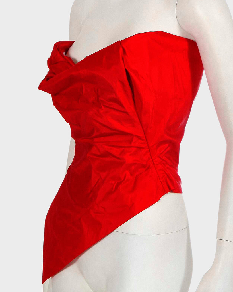Gold on ivory couture label; the boned internal layer with nude stretch jersey sides and zipper to front, with draped external red taffeta layer forming asymmetric hem.