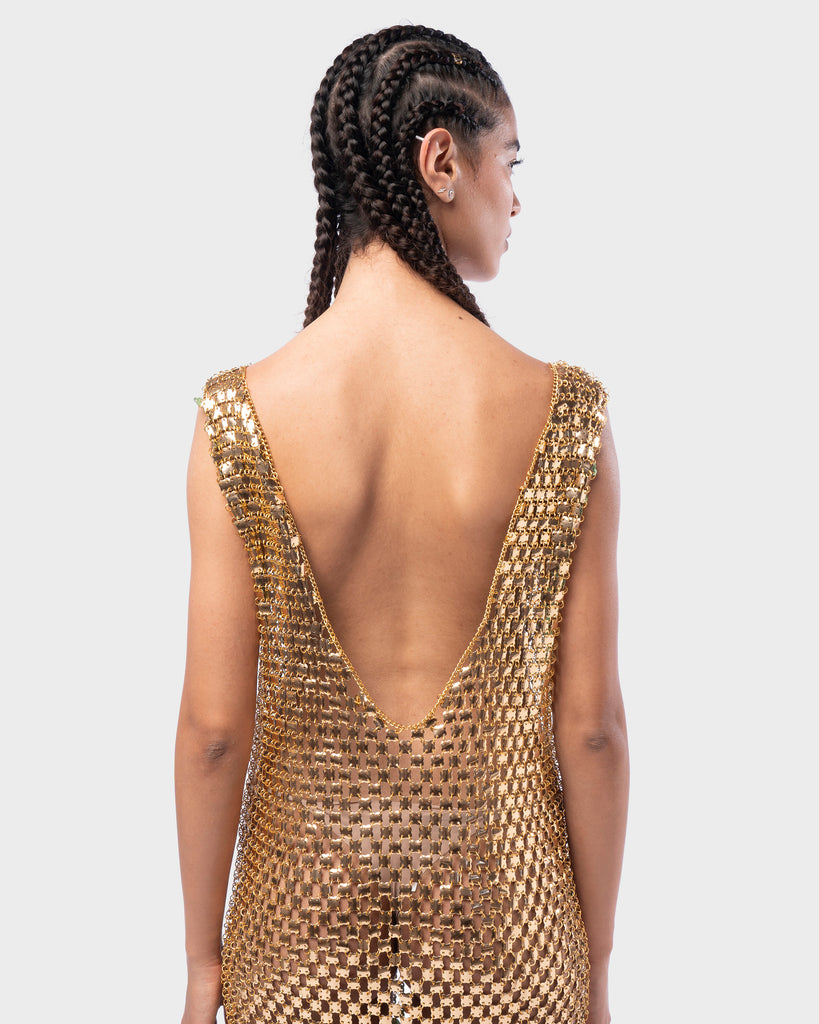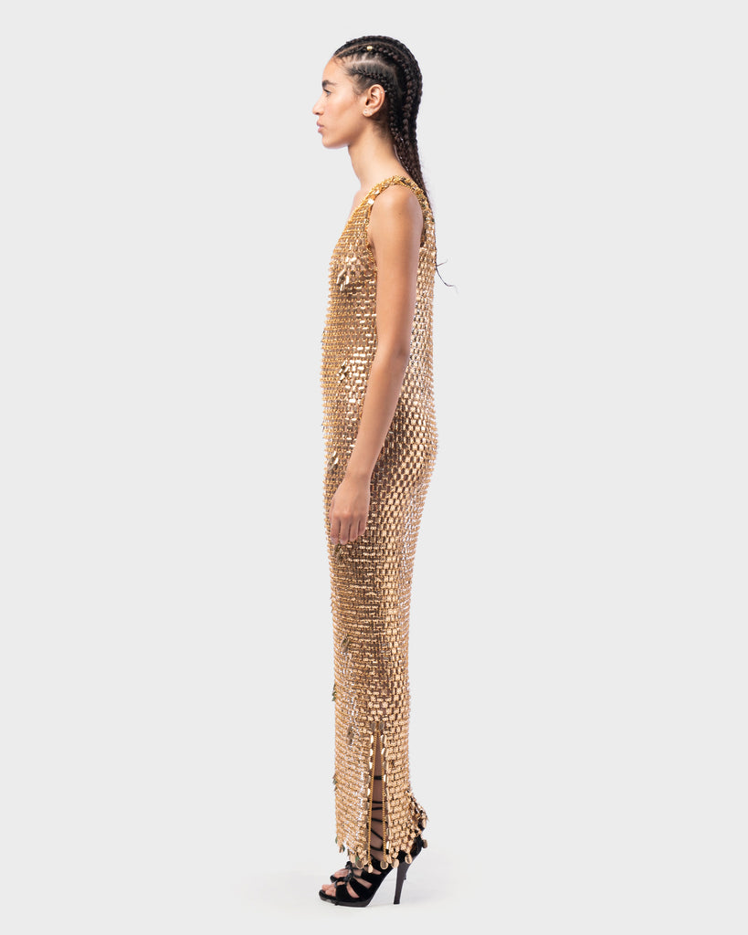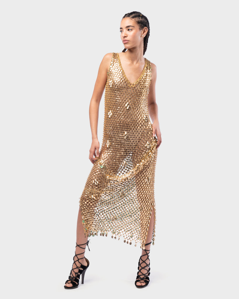 Vintage late 60s Paco Rabanne gold tone chain mail maxi dress