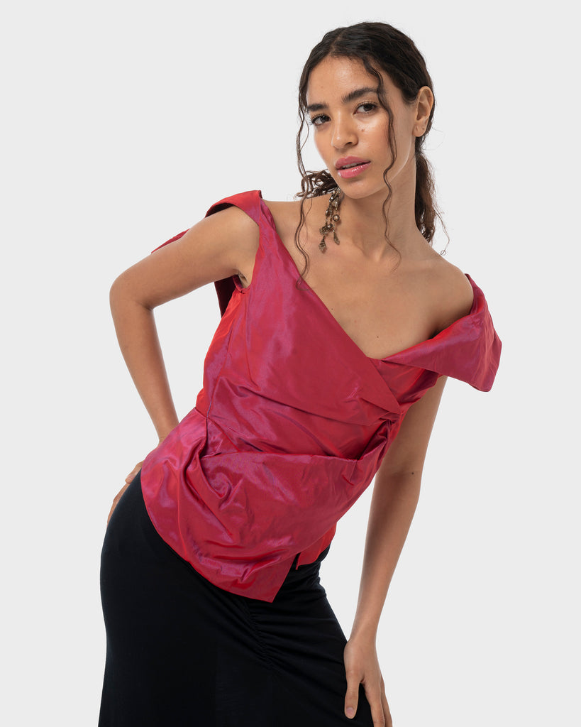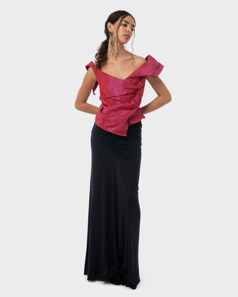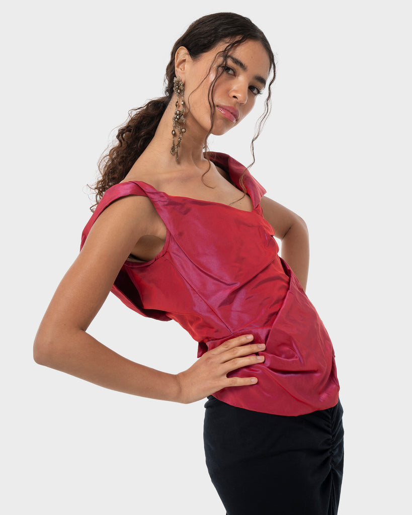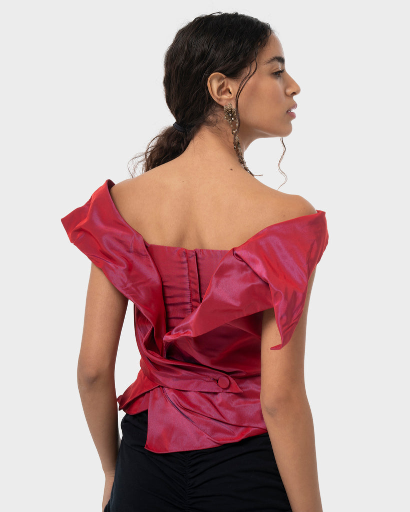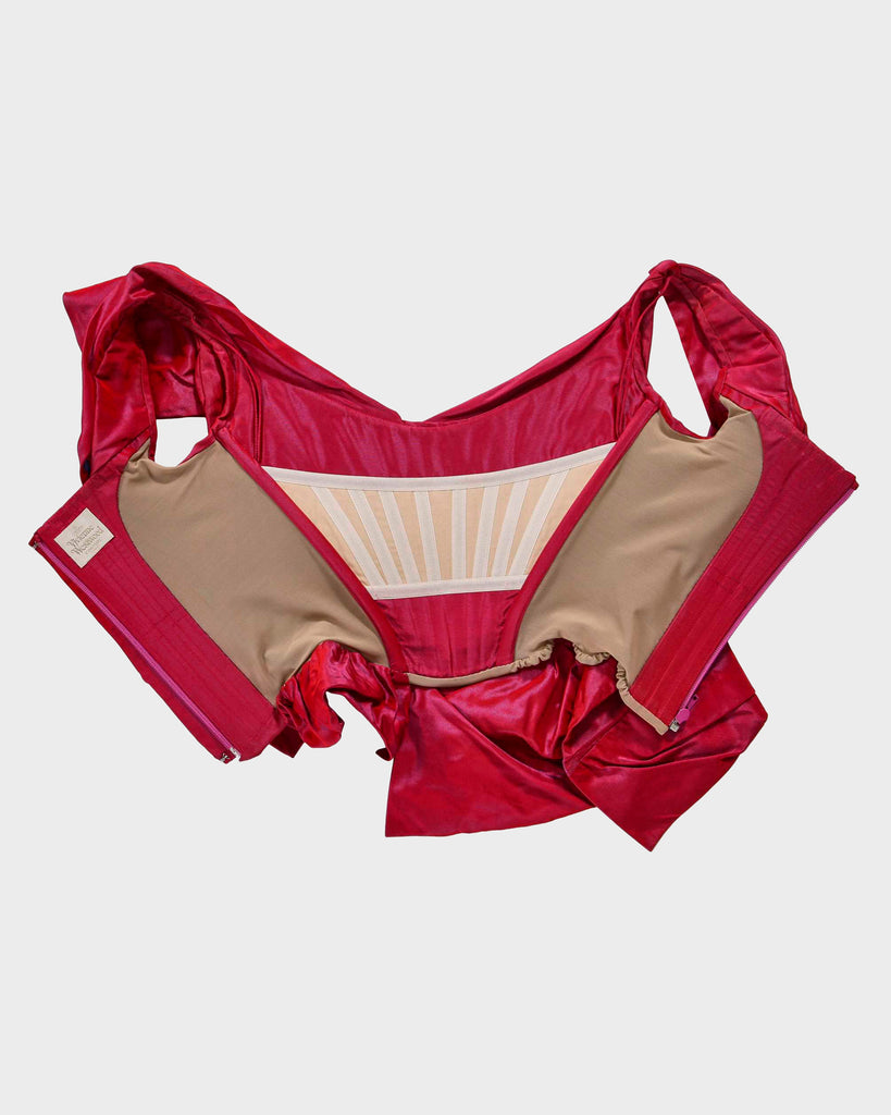 Gold on ivory couture label, the boned corset draped with blue and red shot-silk faille, with asymmetric straps and hem, zip to centre back.