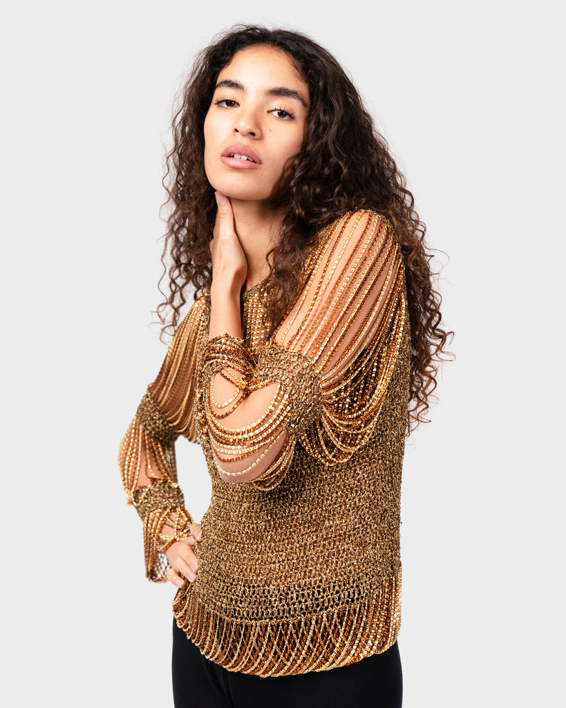 Loris Azzaro vintage 70s gold lurex knitted top with chains